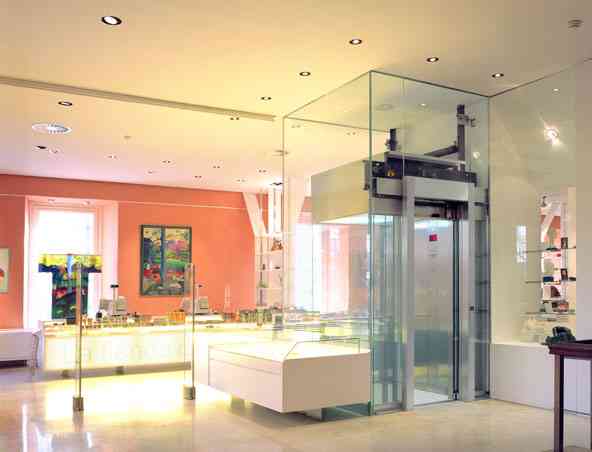 – 1 600kg-panoramic hydraulic lift that connects the store to the cafeteria, whose glass panels are the structure..